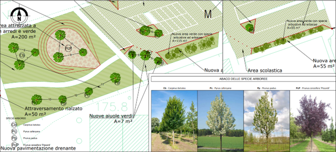 • opere a verde con essenze in grado di filtrare gli inquinanti atmosferici, corredati da un parco giochi, aree pedonali a servizio delle scuole per migliorare la loro accessibilità, assieme a punti per la sosta delle biciclette (rastrelliere), panchine ed altri elementi di arredo urbano.